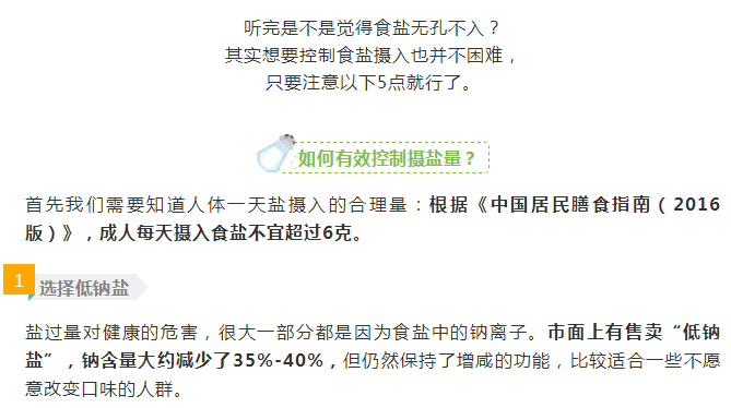 除了食盐,很多调味料的含盐量都较高,例如酱油、鸡精,甚至番茄酱的钠含量也不低。建议使用含盐量低的食材调味,例如用薄盐酱油,少用鸡精,用香菇、虾皮提鲜。