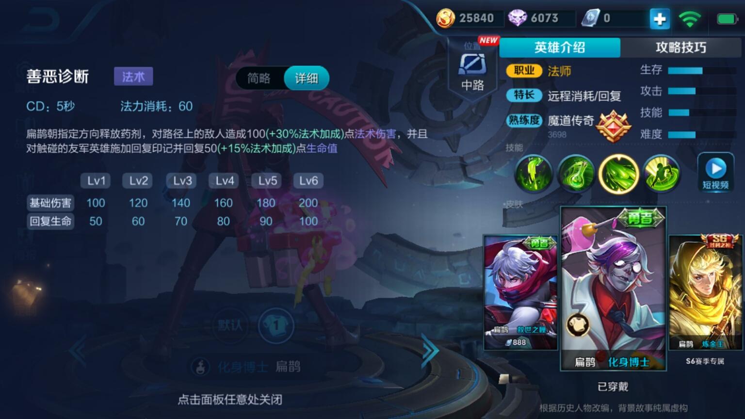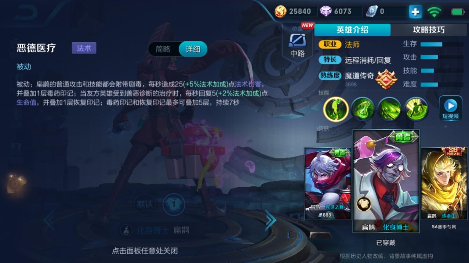 这期要跟大家分享的是素有“绝命毒师”之称,王者峡谷里善用毒功的顶尖高手,毒王扁鹊。可以看到,扁鹊的初始属性显得平平无奇,血量堪比花木兰和姜子牙这样的脆皮,移速也是较低的350,抗性方面也没什么突出的项目,总而言之,扁鹊是一个乍看属性很平庸的英雄,关于其定位也是比较微妙,既有人用他来打辅助,也有人用他来充当C位,但扁鹊的伤害机制又比较特殊,这让他在团战中的作用显得摇摆不定。