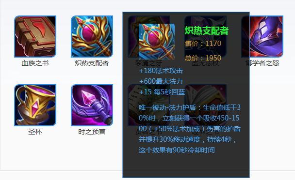 在拥有了三件套之后,扁鹊可以考虑提高一下自己的生存能力了。【炽热支配者】这件装备,给扁鹊提供了600点的额外法力值(频繁使用1技能的扁鹊是很缺蓝的),此外,它的被动效果护盾加移速,可谓是保命神技了。一个拥有三件套和支配者的扁鹊,按照1级英雄来算,护盾值为450+0.5(140+240*2+180)=850点,要知道同等状态下魔女斗篷才只能提供320点的法术护盾,而30%移速加成更是让扁鹊拥有了105点的额外移动速度。