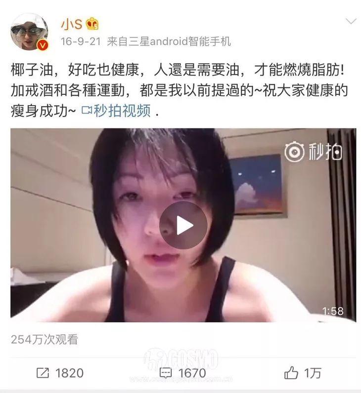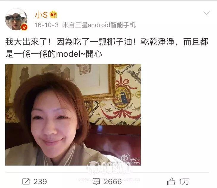 小S很敢说,大家都知道。一般来说,女明星不太会把便秘啊皮肤很差啊微调这种事情拿出来讲。但是为了给大家分享美丽心经,小S也频频在微博上表达了对椰子油的爱。