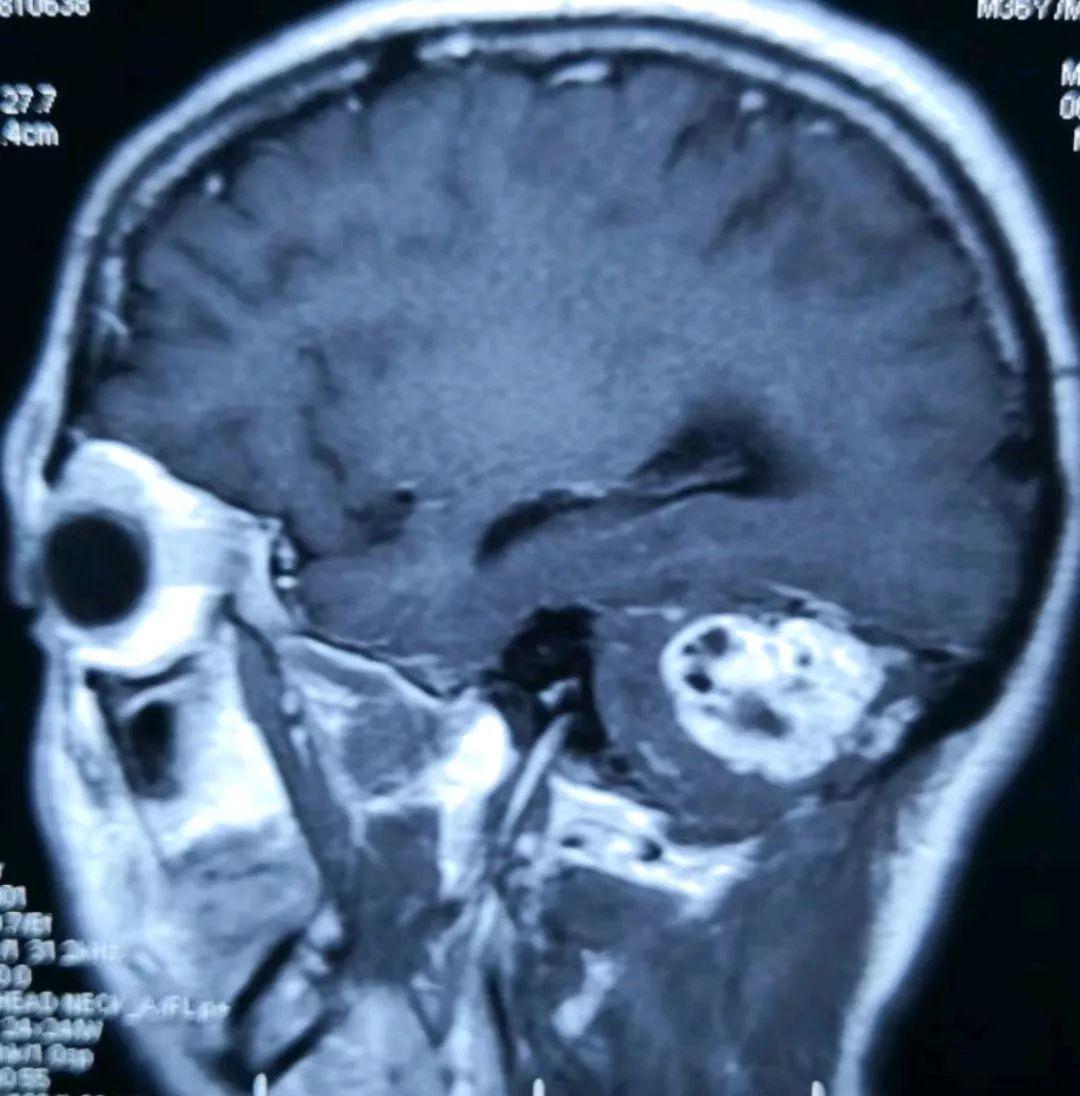 另一位置的增强磁共振提示肿瘤长向小脑深部,靠近脑干组织(人的生命中枢)