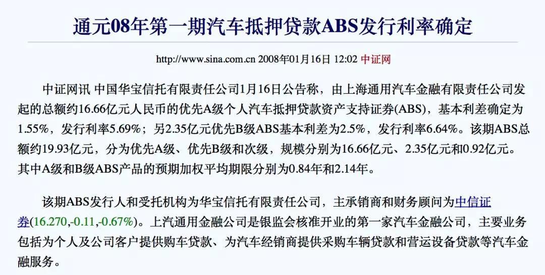 2008年1月,通用金融发行了第一单汽车抵押*款贷**ABS,当时没人想到,整个汽车金融行业的第二单ABS一直要等到2012年才重新启动。