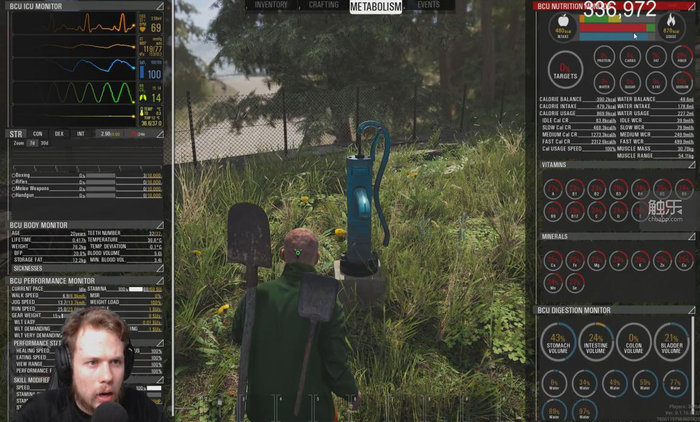 一般来说,为了保持自己的体重和肌肉发达程度,必须保证持续摄入高蛋白和碳水化合物。如若不然,身体素质的数值会因此下降,大幅影响角色战力。玩家自己的新陈代谢状态和生命体征被密密麻麻地列在人物状态栏中:从心跳到血压,从呼吸频率到体温消耗,我们在游戏中每走一步路、每做一个动作都会影响这些数据。