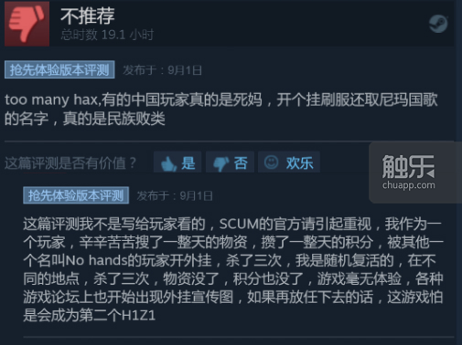 玩家们对于《人渣》的意见基本可以分为两大类。其一是一些平衡性方面的小毛病,比如游戏内资源数量过多、敌人数量过少,导致缺乏紧张感;游戏地图庞大,却没有提供载具给玩家跑路;等等……这些缺点只要开发商注重听取玩家的声音,积极更新游戏,很快就可以解决。毕竟游戏目前还在测试,玩家们体验时可以稍微多点耐心,好游戏都是一步步磨出来的。
