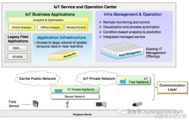 这张图,最下面是物理世界,通过各种传感器将数据采集上来,通过执行器,执行指令,中间是通讯层(Communication Layer),这里包括公有网络(骨干网、3G、4G,未来的NB-IOT等),还有物联网的专网(Zigbee,lora,wifi)。最上层的是应用。通过在线分析,线下分析,监控与控制,优化业务。应用层的主要功能包括:远程监控、过程自动化和可视化、基于条件的分析和预测、集成服务管理等等。