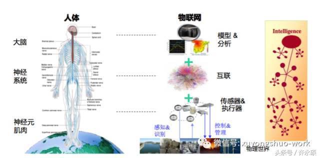 这张图做了一个非常形象的类比:传感器、执行器类比于人类的神经元和肌肉;互联类比于神经系统;模型和分析类比于大脑。物联网是类比于人体。