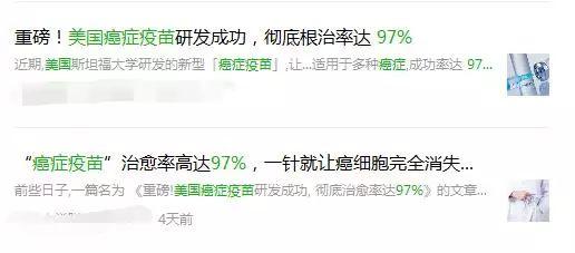 近期,肿瘤界可谓热闹非凡,朋友圈里面传播着各种各样治愈癌症的信息,真是让人眼花缭乱、应接不暇,大有乱花渐欲迷人眼,浅草才能没马蹄之势。不久前澳洲战胜了癌症的文章霸占了朋友圈,这两天又有一篇新作《美国癌症疫苗研发成功,根治率高达97%!》迅速刷屏,这些杰作层出不穷辟谣君真的是无语了。
