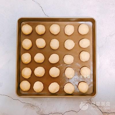 4、将面团取出排气后分成25个小面团,放入铺油布的烤盘中,烤箱发酵至2倍大,烤箱不插电,放碗开水即可