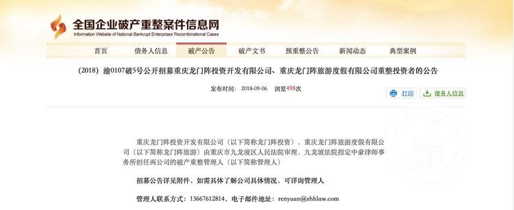 2017年10月,重庆龙门阵投资开发有限公司以其不能清偿到期债务并且资产不足以清偿全部债务为由,向重庆第五中级人民法院申请进行重整。有媒体披露,截至2017年8月底,重庆龙门阵投资开发有限公司的负债率已高达168%,负债已达9.7亿元。