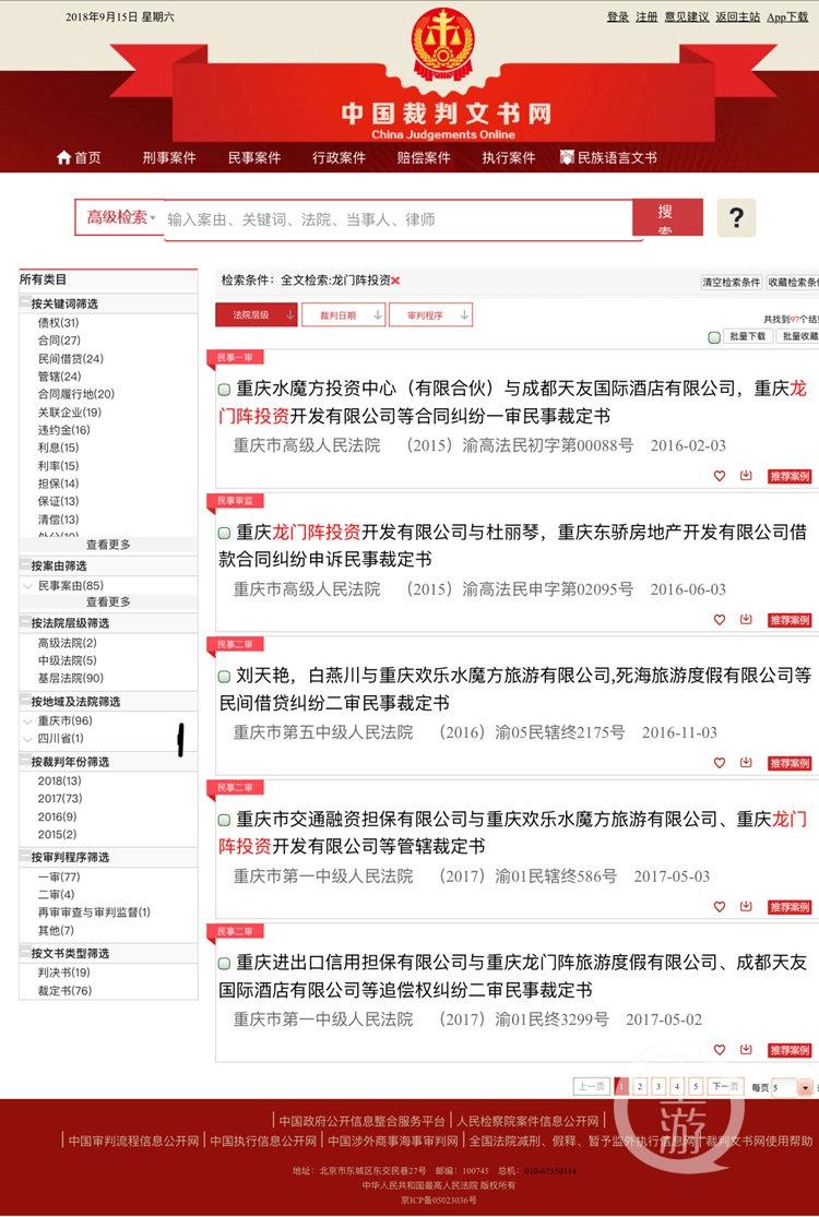 上游新闻记者通过裁判文书网的不完全统计发现,重庆龙门阵投资开发有限公司与其他公司或个人发生债务、合同纠纷共有97条记录。其中,涉及的诉讼66起,失信信息5起,被执行人4起。