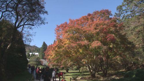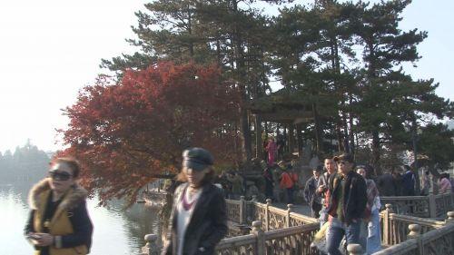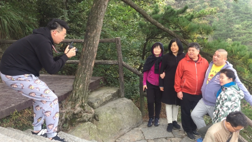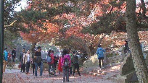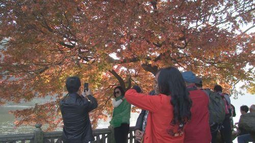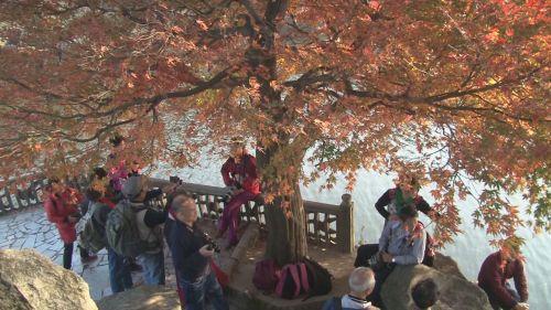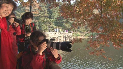 [上海摄影爱好者]:“我希望能够再晚一个星期,这边的秋色还要好。(花径)那边的风景、红叶都有,秋色是现在最好的,就是要过一个星期左右。时间有充足,所以我们上来一个星期,就在这里玩,就是我们深度休闲旅游。”