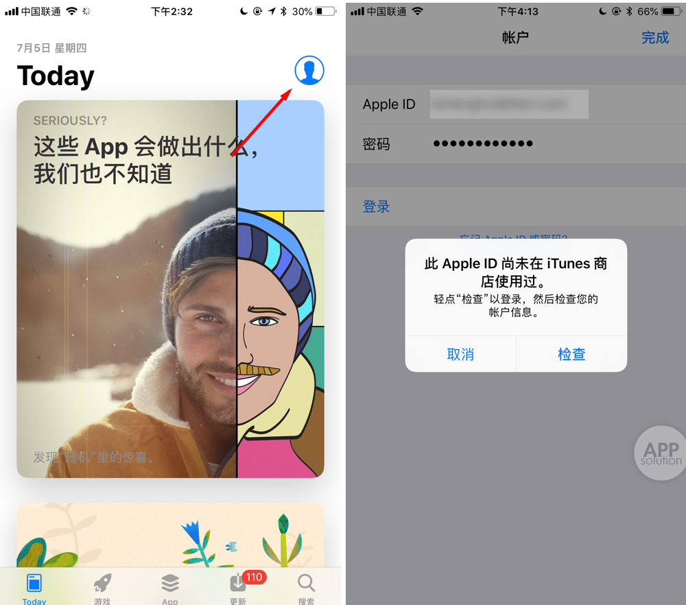 紧接着,打开 App Store,点击右上角的头像将当前的账号登出,并登陆你刚刚注册的 Apple ID。这时,由于你的账号是第一次登陆 App Store,苹果会提示你「检查」这个账号,点击即可。