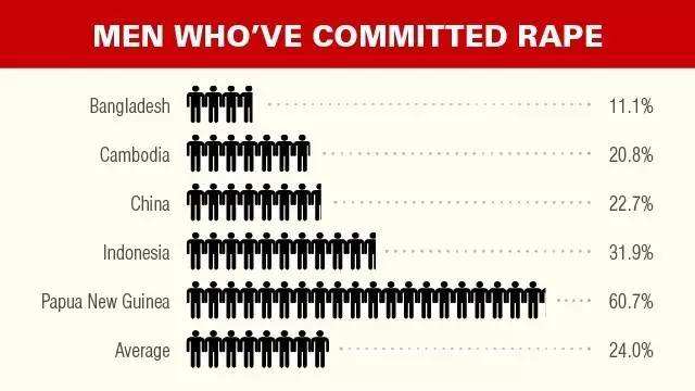 如果真的存在所谓的“强奸文化”,那我们应该明白每个国家因其对性*力暴**的纵容或惩罚程度不同,因此性*力暴**比率差异也很大。我们确实意识到了这种差异。我们也许还记得,在美国,有6%到14.9%的大学生坦白自己有过强奸行为。这个数据似乎挺吓人的,但还有比这更吓人的。发表在医学杂志《柳叶刀》上的一篇研究报告上有这样的数据⑦:在中国,将近23%的人声称自己有过强奸的行为,而在巴布亚新几内亚,这类人就占了60.7%,这个数字真是让人不忍直视。