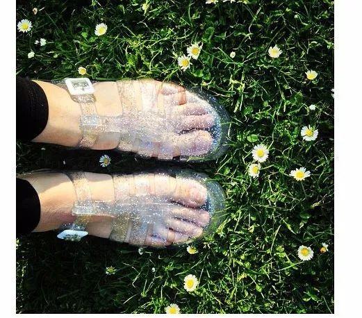 透明的果冻鞋有着裸鞋的属性,易于搭配。减龄是其最大的属性,所以更适合时尚感的年轻女生。